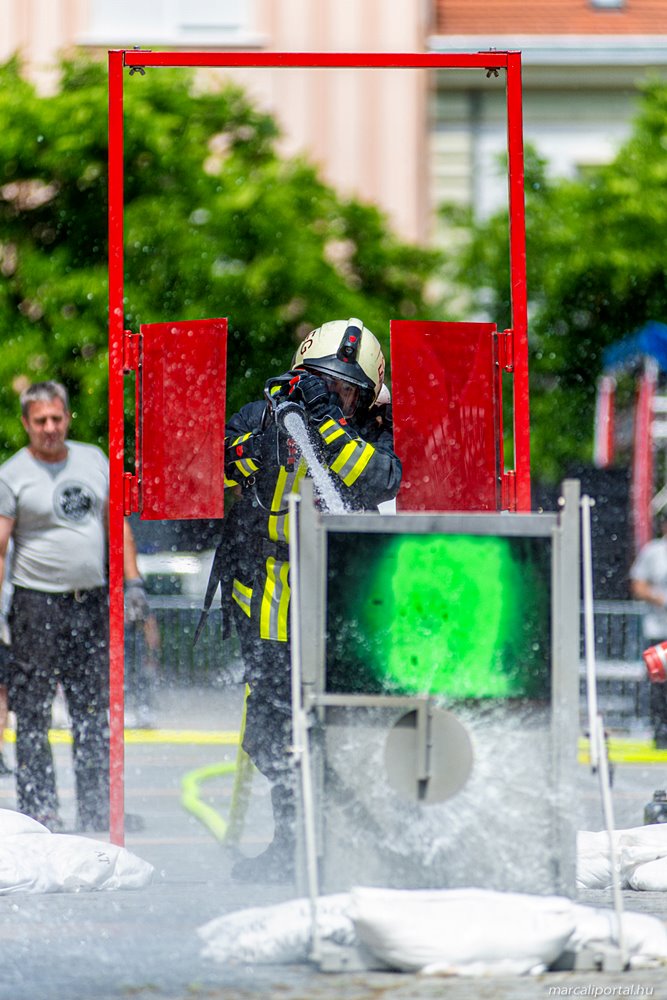 Az indulóknak nagyon nehéz dolguk volt, hiszen a rekkenő hőséggel is meg kellett küzdeniük. A próbatételek első etapjába tizenkét méter magas állványra futottak fel a vállukon tizenkilenc kilogrammos tömlőt cipelve, majd felhúztak egy ugyanilyen nehéz tekercstömlőt, ezt követően futottak le az emelvényről. Ezután négykilós kalapáccsal ütöttek odébb egy gerendadarabot, majd az úgynevezett „C” sugárral célba is kellett lőniük. Mindezek után egy nyolcvan kilogrammos bábut húztak be a célba. Rövid szünet után jött a második versenypálya, ahol már légzőkészülék nélkül teljesíthettek. Itt egy öt kilogrammos kalapáccsal ütöttek ötven-ötven leütést, majd két, egyenként tizenöt kilogrammos súlybőröndöt vittek a kijelölt helyre. A pályát két darab „B” tömlő összetekerésével zárták. A stopper számlálója csak akkor állt meg, ha a tömlőt a kalodába bele tudták helyezni és megnyomták a piros gombot. A két pályán produkált időeredmény összegéből alakult ki a végeredmény. A női indulók néhány versenyszámban könnyítést kaptak, azonban a pályát nekik is időre kellett teljesíteniük.